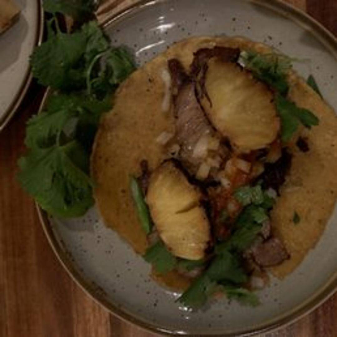 A vibrant taco featuring thinly sliced, marinated pork, slow-cooked to perfection, typically served on a warm tortilla with grilled pineapple, diced onions, and fresh cilantro, offering a delightful balance of sweet and savory.