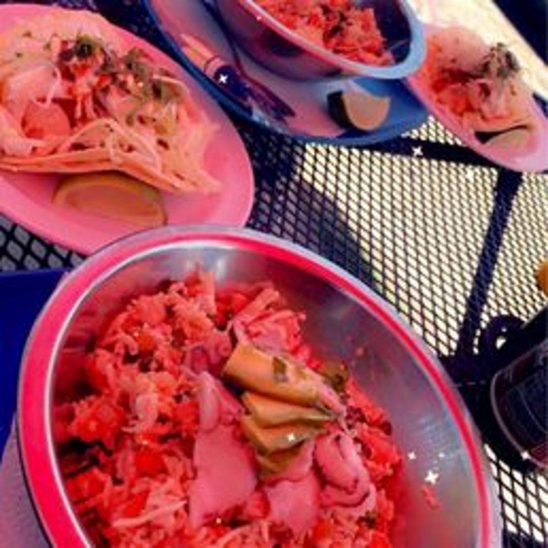 Two warm tortillas filled with succulent, perfectly seasoned shrimp, typically grilled or pan-seared to tender perfection. Each taco is generously topped with a vibrant array of fresh ingredients, often including crisp shredded cabbage, creamy avocado slices or guacamole, tangy pico de gallo, and a drizzle of zesty lime crema or a secret house sauce, delivering a balanced and refreshing flavor profile.