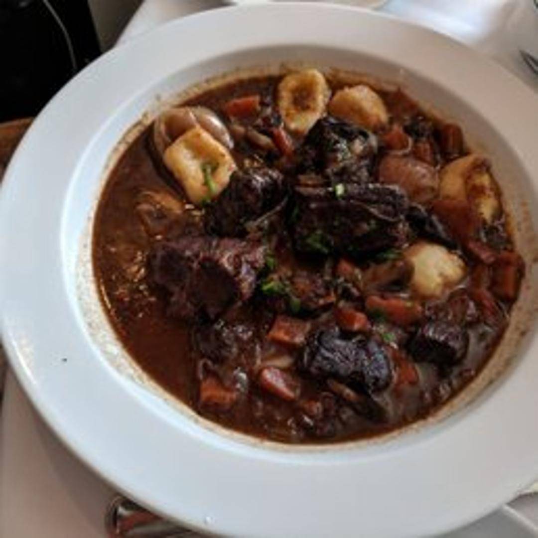 A quintessential French comfort dish, slow-cooked to perfection. Tender chunks of select beef are patiently braised in a rich Burgundy red wine sauce, imbued with the savory flavors of pearl onions, earthy mushrooms, and crispy lardons (bacon). A deeply satisfying and aromatic stew, traditionally served with creamy mashed potatoes or crusty bread.