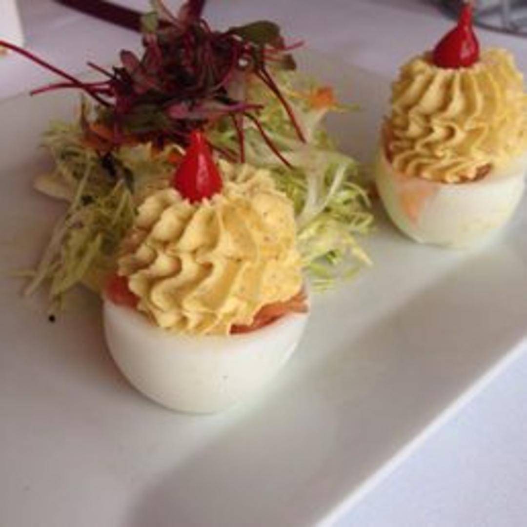 A classic appetizer reimagined with a touch of French flair. Delicate hard-boiled egg whites are halved and generously filled with a rich, creamy yolk mixture, subtly seasoned with Dijon mustard, a hint of mayonnaise, and finely chopped fresh chives, elegantly piped and garnished with a light dusting of paprika.