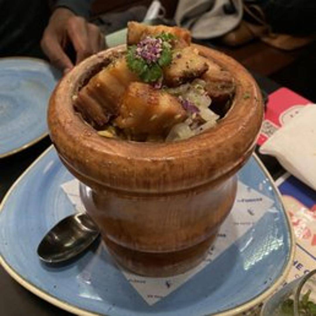 Experience a rich twist on a classic with our Pork Belly Mofongo. This hearty dish features a savory base of mashed green plantains, seasoned with garlic, olive oil, and crispy pork cracklings. It is generously crowned with tender, slow-cooked pork belly that is then crisped to perfection, offering a delightful combination of textures and deep, savory flavors.