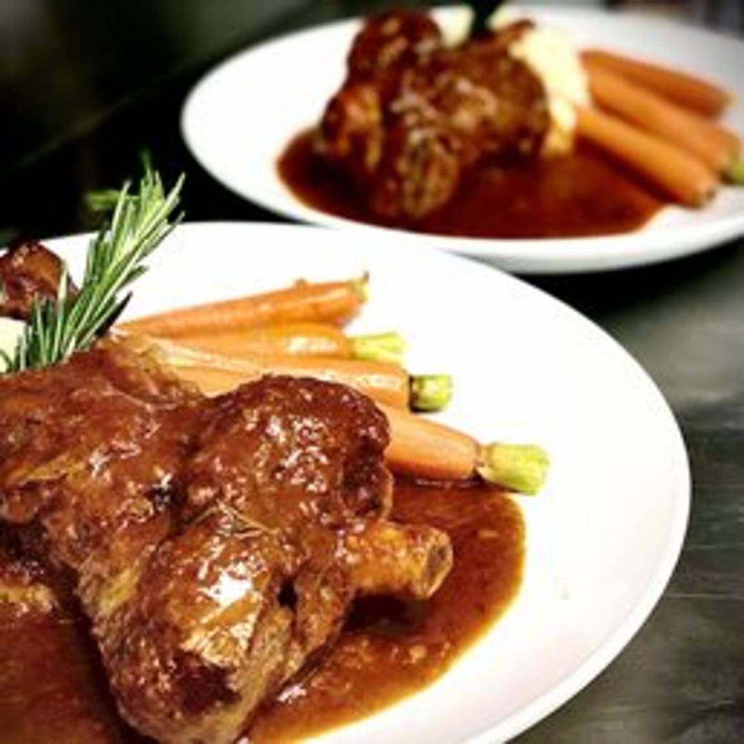 Our exquisite Lamb Shank is slow-braised to tender perfection, resulting in fall-off-the-bone meat infused with rich flavors. It's simmered in a robust red wine reduction with aromatic herbs and served with a complementary side, offering a truly comforting and indulgent dining experience.
