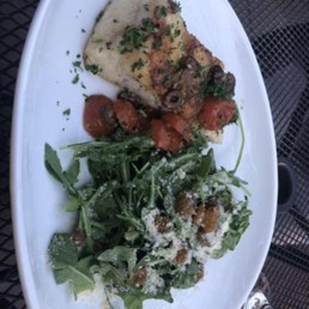 Pan-seared sea bass fillet, served with lemon-herb sauce and seasonal vegetables.