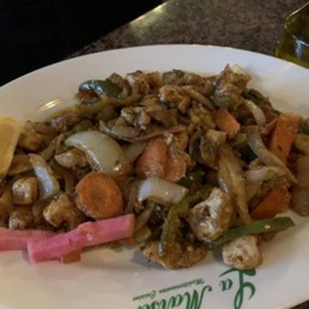 A flavorful stir-fry of marinated chicken, vegetables, and spices. Served with rice.