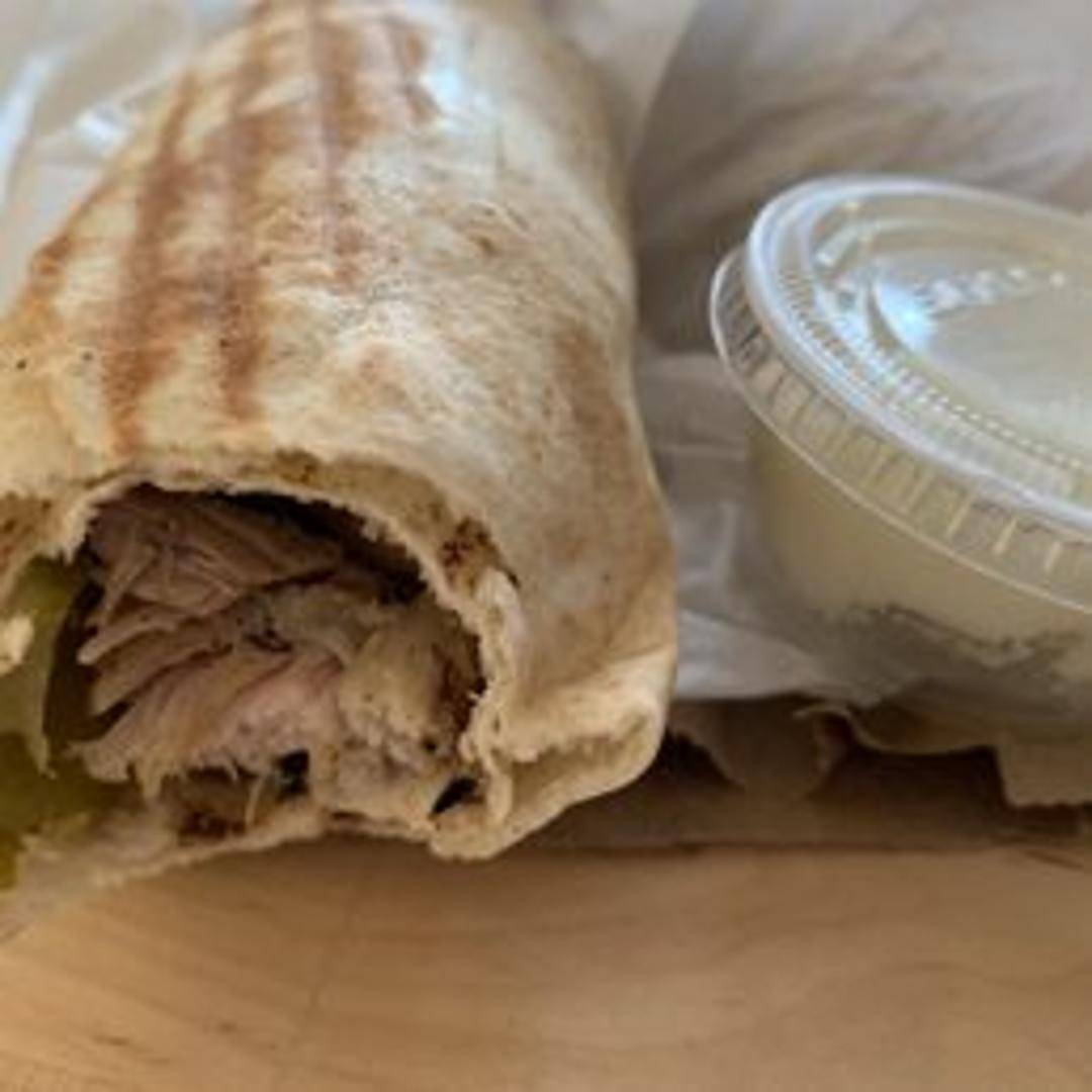 Thinly sliced, marinated chicken roasted on a vertical spit, served in a pita bread with garlic sauce, pickles, and tomatoes.