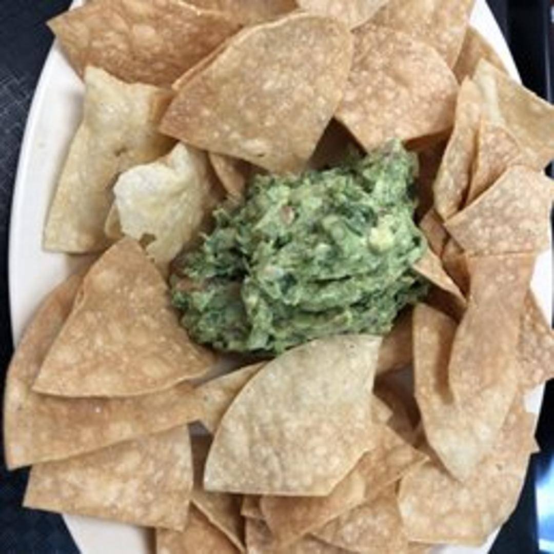 A classic Mexican appetizer featuring a generous portion of freshly fried, lightly salted tortilla chips served alongside a vibrant, house-made guacamole. Our guacamole is crafted from ripe avocados, minced onions, cilantro, a hint of jalapeño, and a squeeze of fresh lime juice for a perfectly creamy and zesty dip.
