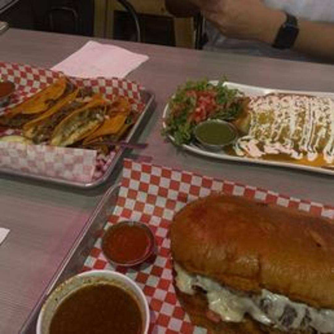 A Mexican sandwich filled with juicy, slow-cooked birria meat, onions, cilantro, and your choice of toppings like pickled onions or salsa. Served with a side of consommé for dipping.