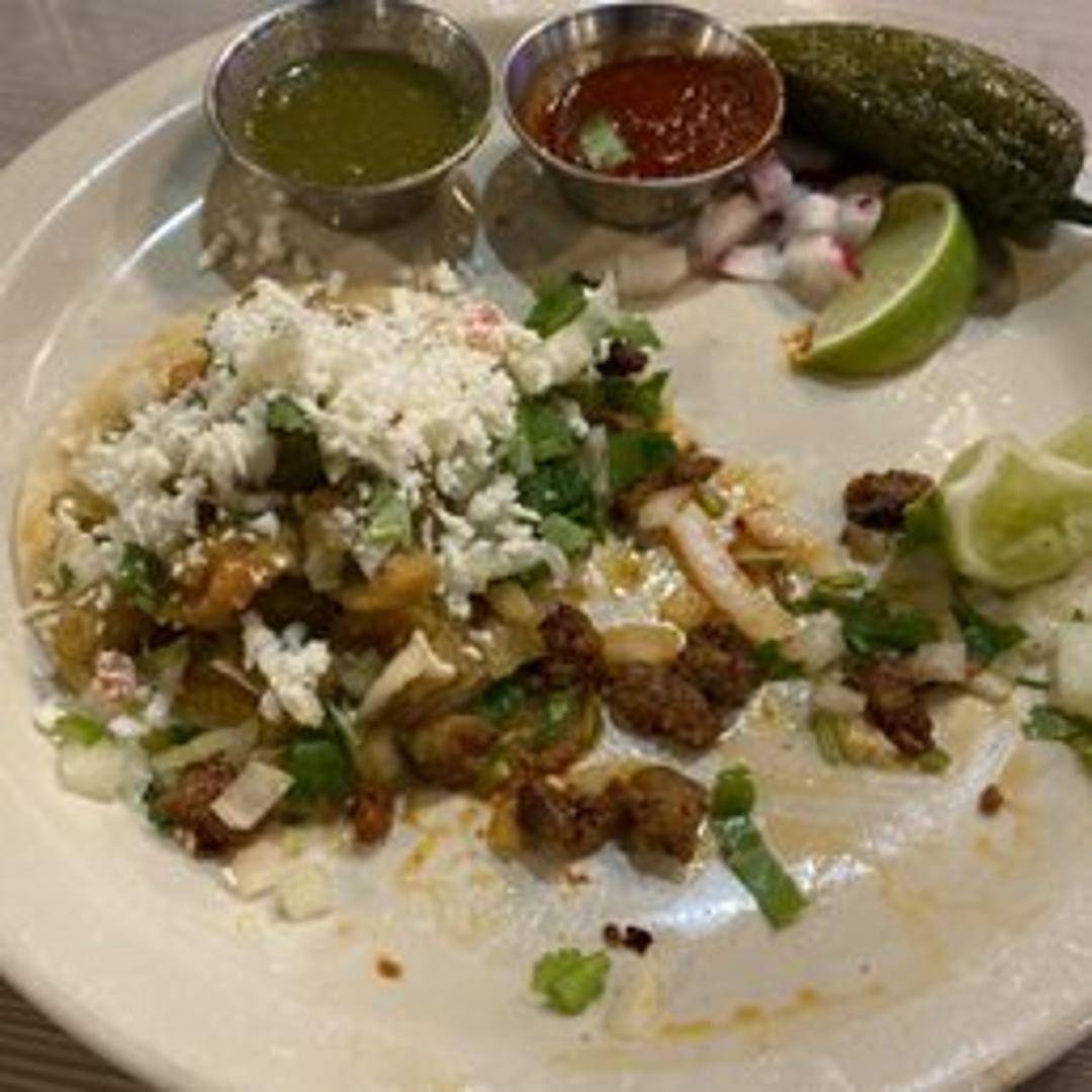 A hearty taco filled with diced steak, bacon, bell peppers, and onions, all grilled together and topped with melted cheese. Served on a warm corn or flour tortilla.