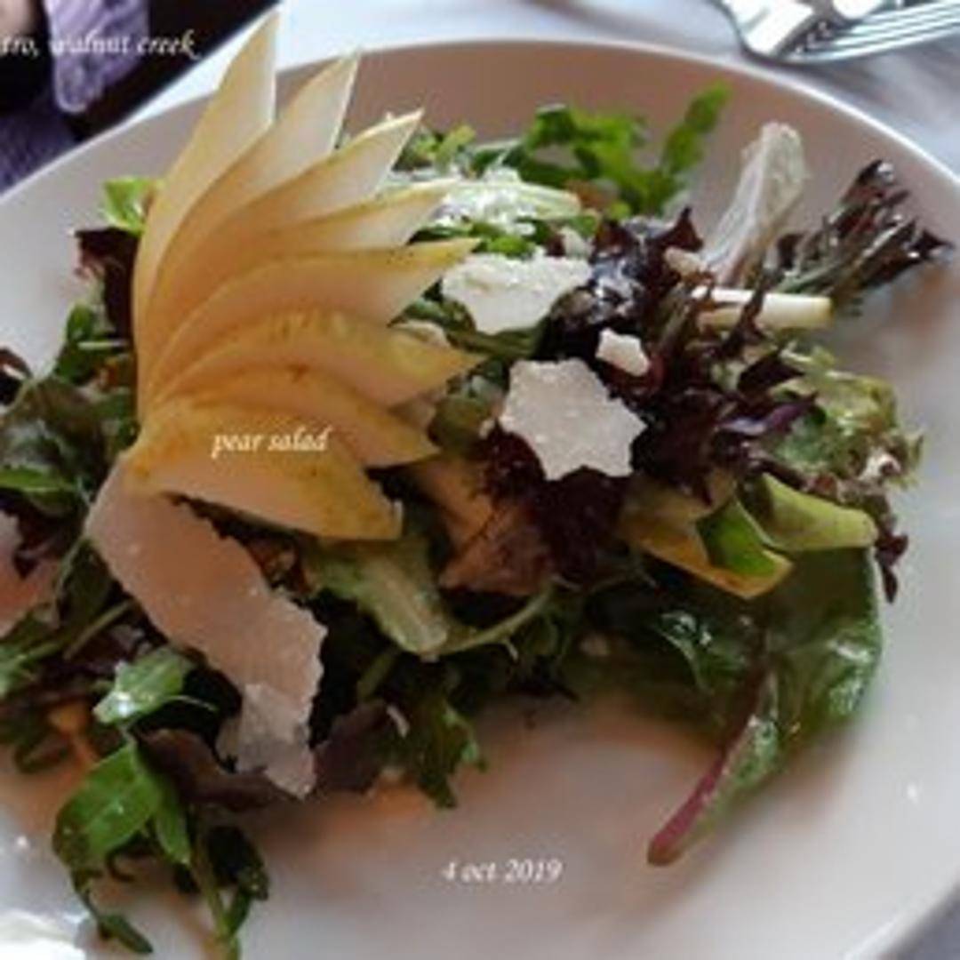 A refreshing salad featuring sliced pears, mixed greens, crumbled cheese (often goat or blue cheese), and toasted nuts (such as walnuts or pecans). Typically dressed with a light vinaigrette.