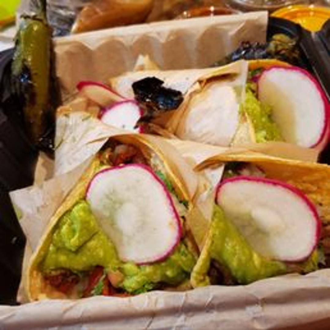 Three of La Taqueria's signature Tijuana Tacos. Each features a generous portion of grilled meat (typically carne asada or adobada) piled high on a doubled-up corn tortilla. Topped with a special blend of salsas, guacamole, and sometimes cheese, offering a flavorful and satisfying meal inspired by the border city.