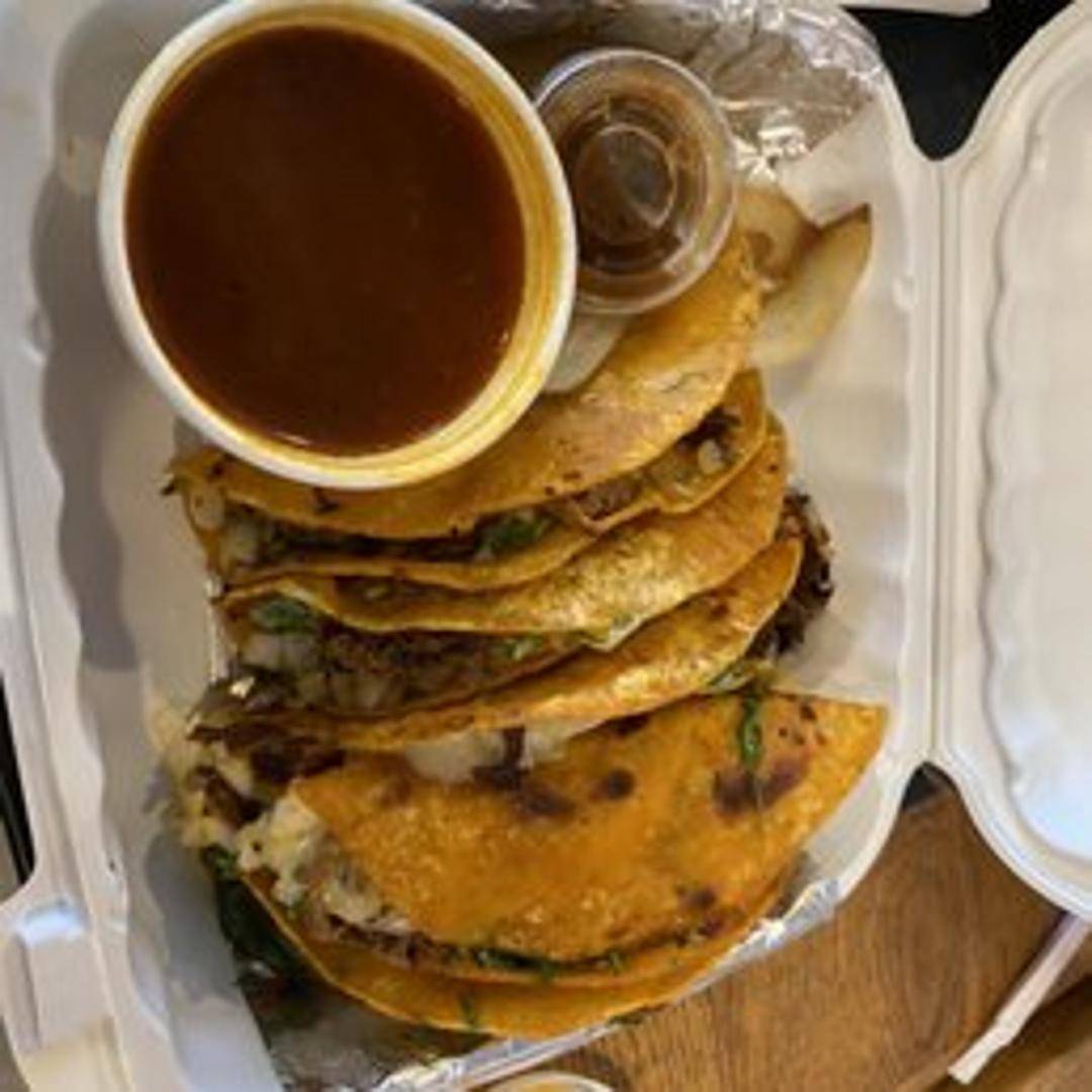 Three birria tacos with melted cheese, served with a side of consommé for dipping. A cheesy and savory twist on the classic birria taco, tripled for your enjoyment.