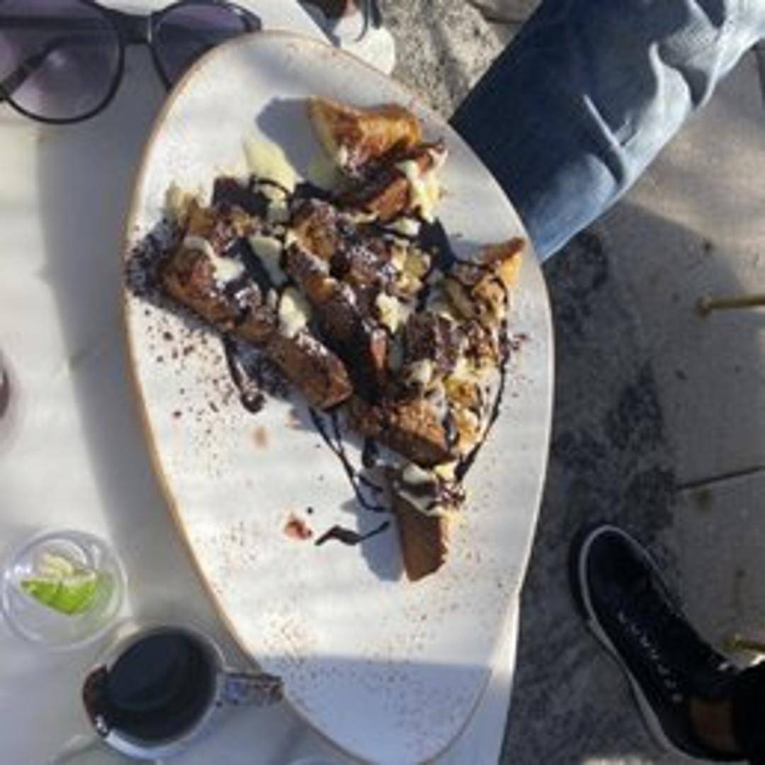 A decadent fusion breakfast or dessert item, combining the rich, coffee-infused flavors of classic tiramisu with the comforting warmth of French toast. Thick-cut brioche or challah bread is soaked in a sweet, espresso-laced custard, griddled until golden, and layered with creamy mascarpone cheese, dusted with cocoa powder.