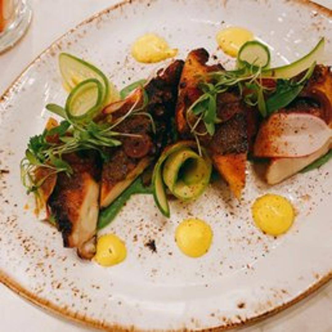 Tender and succulent octopus, expertly grilled to achieve a perfect char, served with a vibrant medley of Mediterranean flavors, offering a delightful balance of texture and taste.