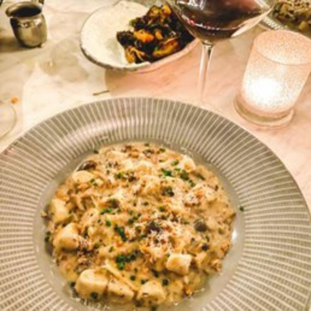 Indulge in delicate, pillowy potato gnocchi tossed in a rich, creamy sauce infused with the exquisite aroma and flavor of black truffles, creating a luxurious and comforting culinary delight.
