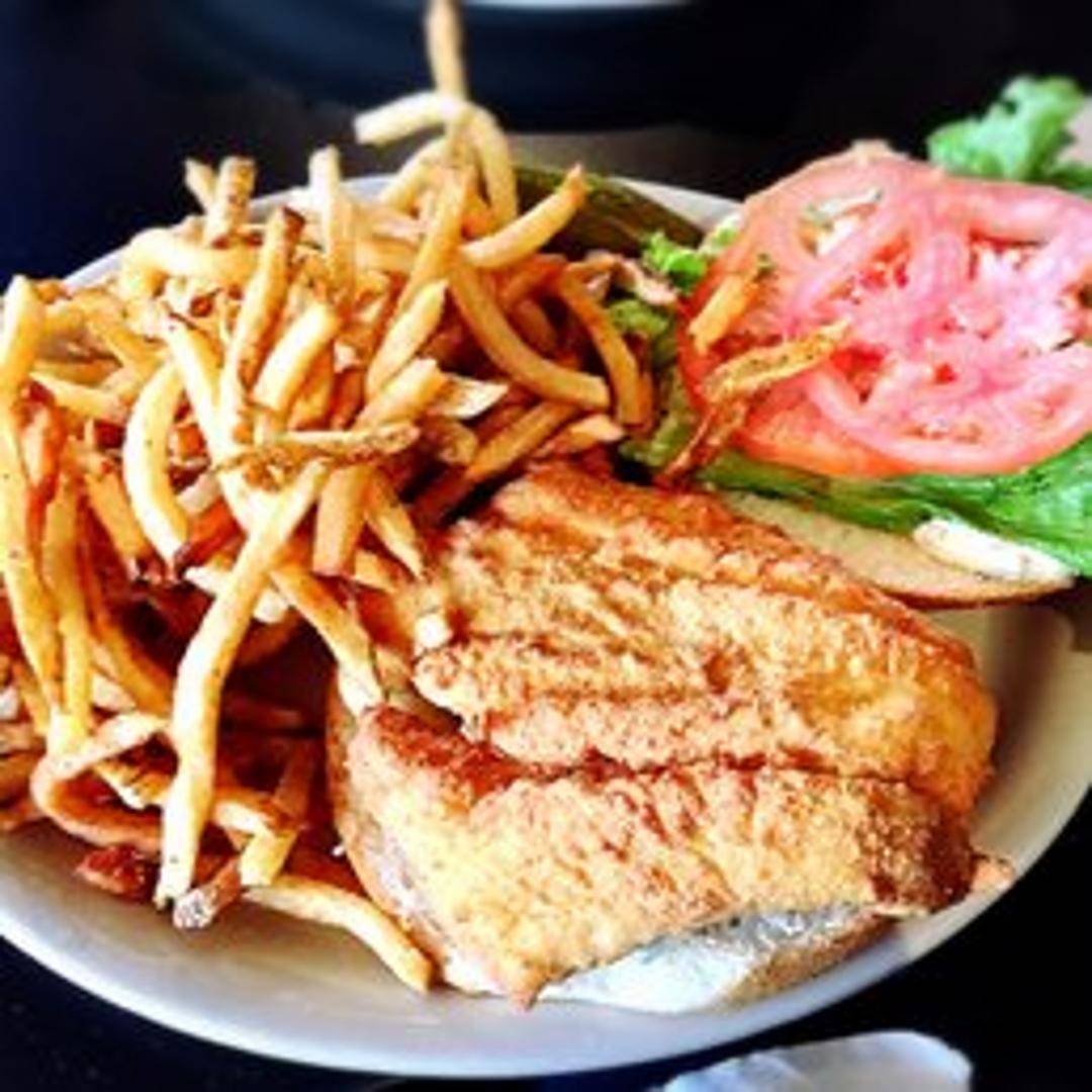 A crispy fried fish fillet served on a toasted bun with lettuce, tomato, and tartar sauce. Served with your choice of side.