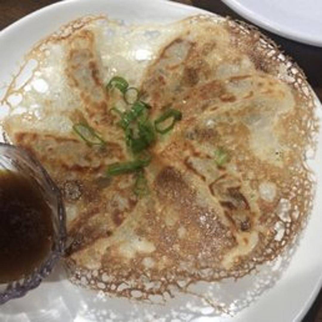 Pan-fried dumplings filled with a savory mixture of ground pork and vegetables, served with a side of dipping sauce.