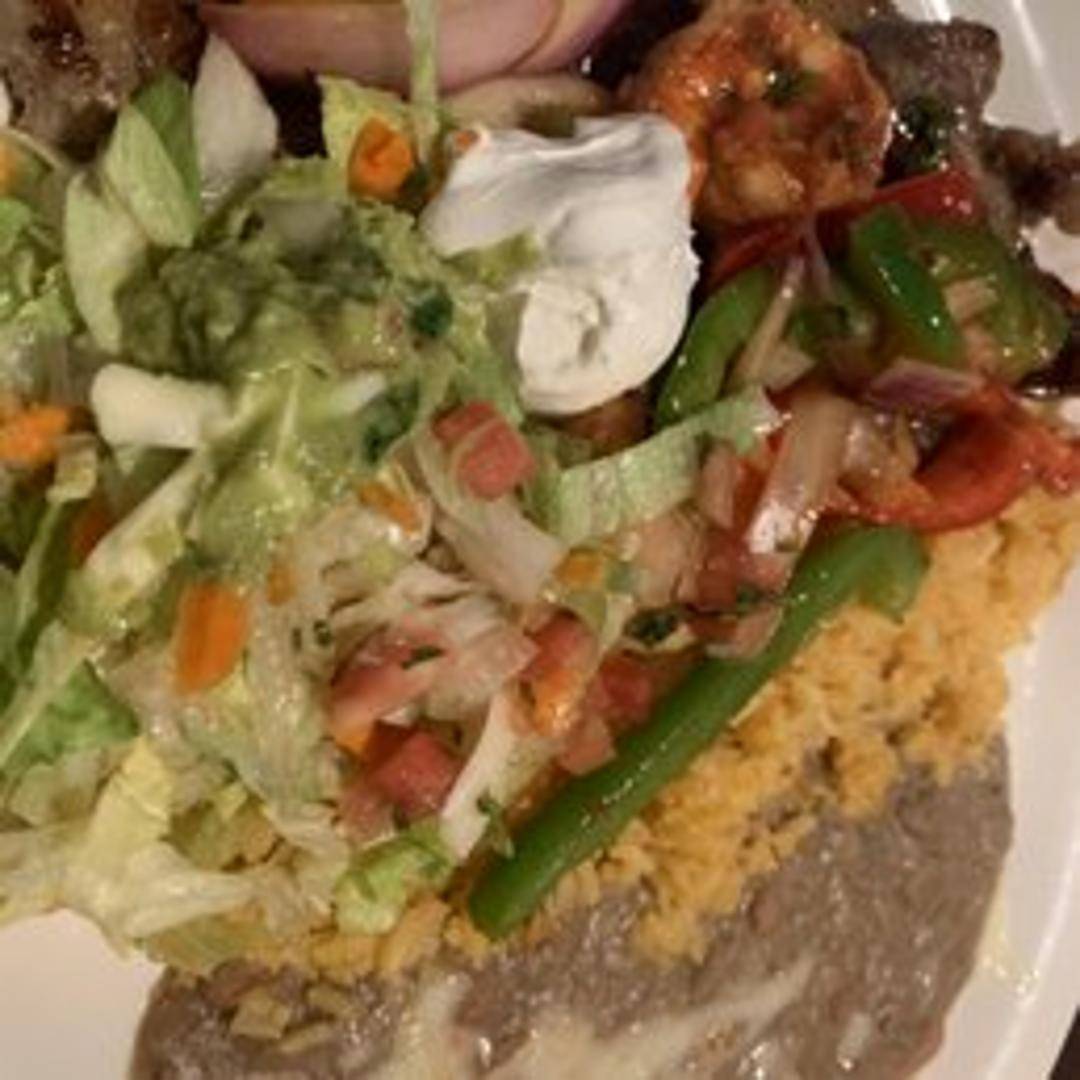 Grilled steak served alongside succulent grilled shrimp. Accompanied by rice, beans, and your choice of tortillas.