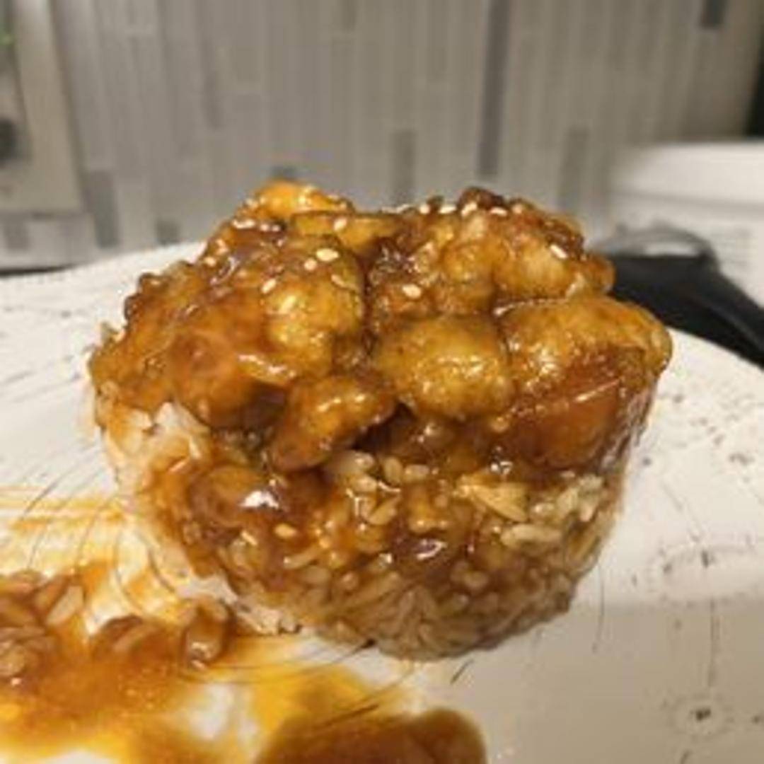 Crispy, bite-sized pieces of chicken coated in a tangy and sweet sauce made with vinegar, sugar, soy sauce, and ketchup. Stir-fried with bell peppers, onions, and pineapple for added sweetness and texture. Served over a bed of fluffy steamed rice and garnished with sesame seeds.