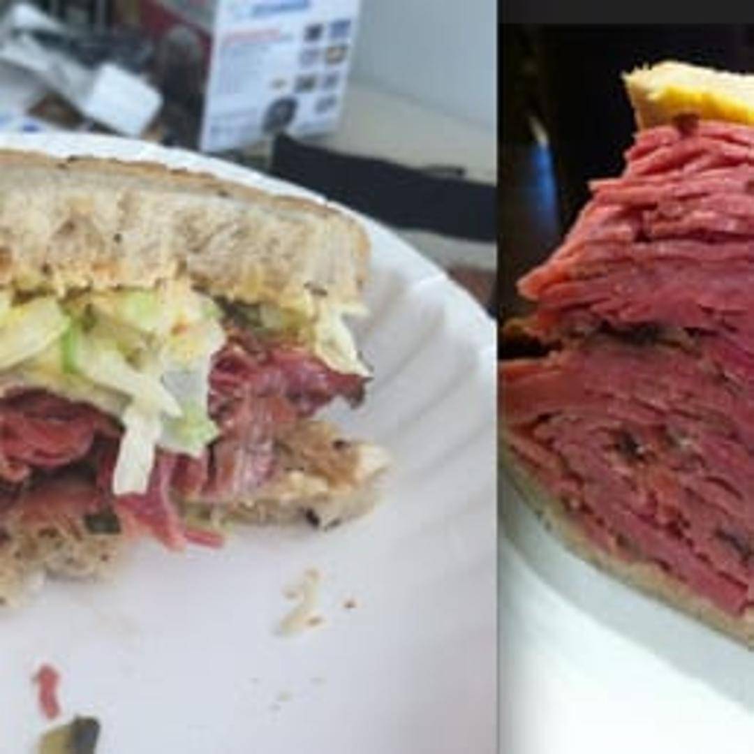A towering sandwich featuring both pastrami and corned beef, piled high on rye bread with mustard. A true delicatessen masterpiece.