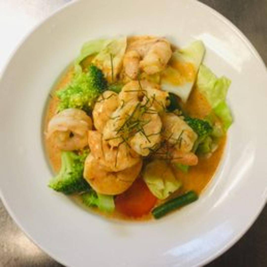 A creamy and slightly sweet curry with bell peppers, basil, and your choice of protein in a coconut milk base, flavored with Panang curry paste.