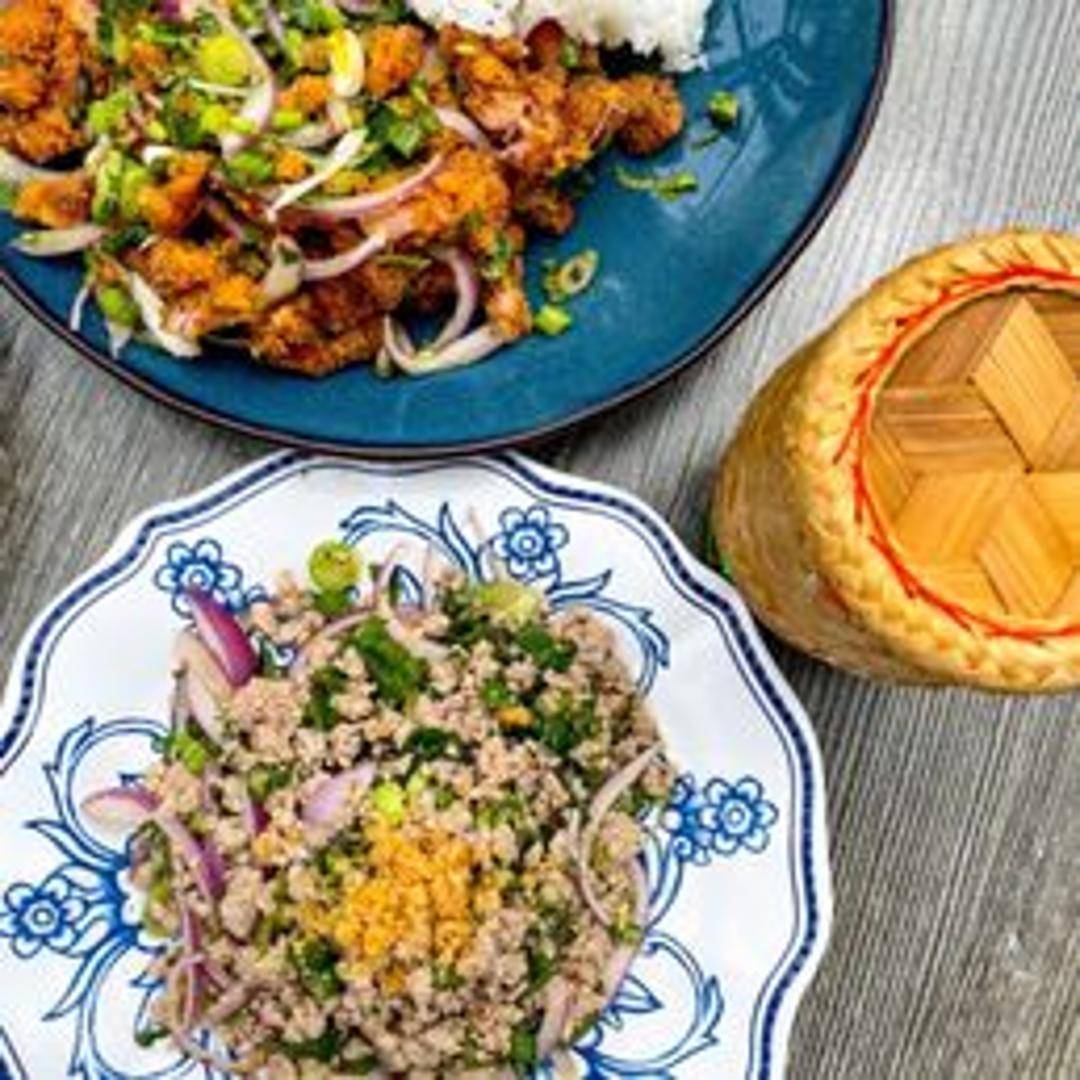 Experience a harmonious blend of textures and flavors with Khao Yum Gai Tod, a vibrant and refreshing Lao rice salad elevated by crispy fried chicken. This signature dish features a medley of aromatic herbs such as mint, cilantro, and saw-tooth coriander, tossed with toasted coconut flakes, roasted peanuts, crunchy crispy rice, and a zesty lime dressing. The salad is generously topped with succulent pieces of perfectly fried chicken (Gai Tod), offering a delightful contrast of tender interior and a beautifully crisp, golden-brown exterior. The dish delivers a complex profile of sour, spicy, sweet, and savory notes, making it a truly authentic and satisfying Lao culinary journey.