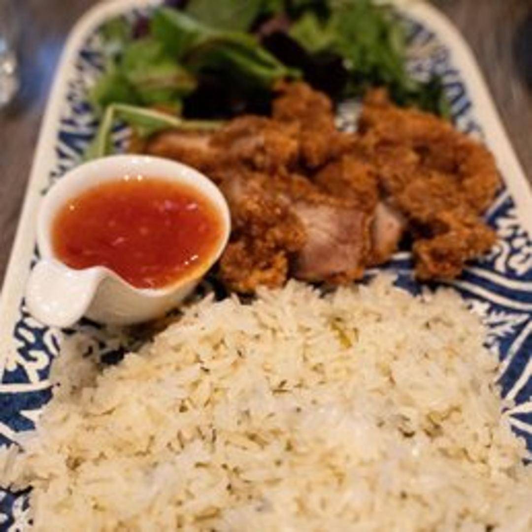 Golden-fried chicken, prepared to a delightful crispness, offering a satisfying crunch with every bite while maintaining a tender and juicy interior. Served alongside fragrant steamed jasmine rice, creating a comforting and popular combination, often accompanied by a savory dipping sauce.