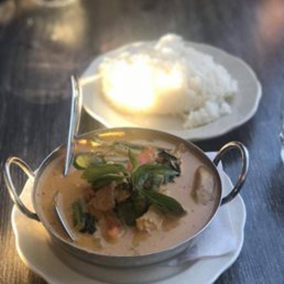 A rich and aromatic Laotian-style curry featuring tender pieces of chicken simmered in a luscious coconut milk broth, infused with a vibrant blend of traditional curry paste, fragrant herbs, and spices. Complemented by crisp vegetables, this hearty dish offers a balanced profile of savory, spicy, and subtly sweet notes.