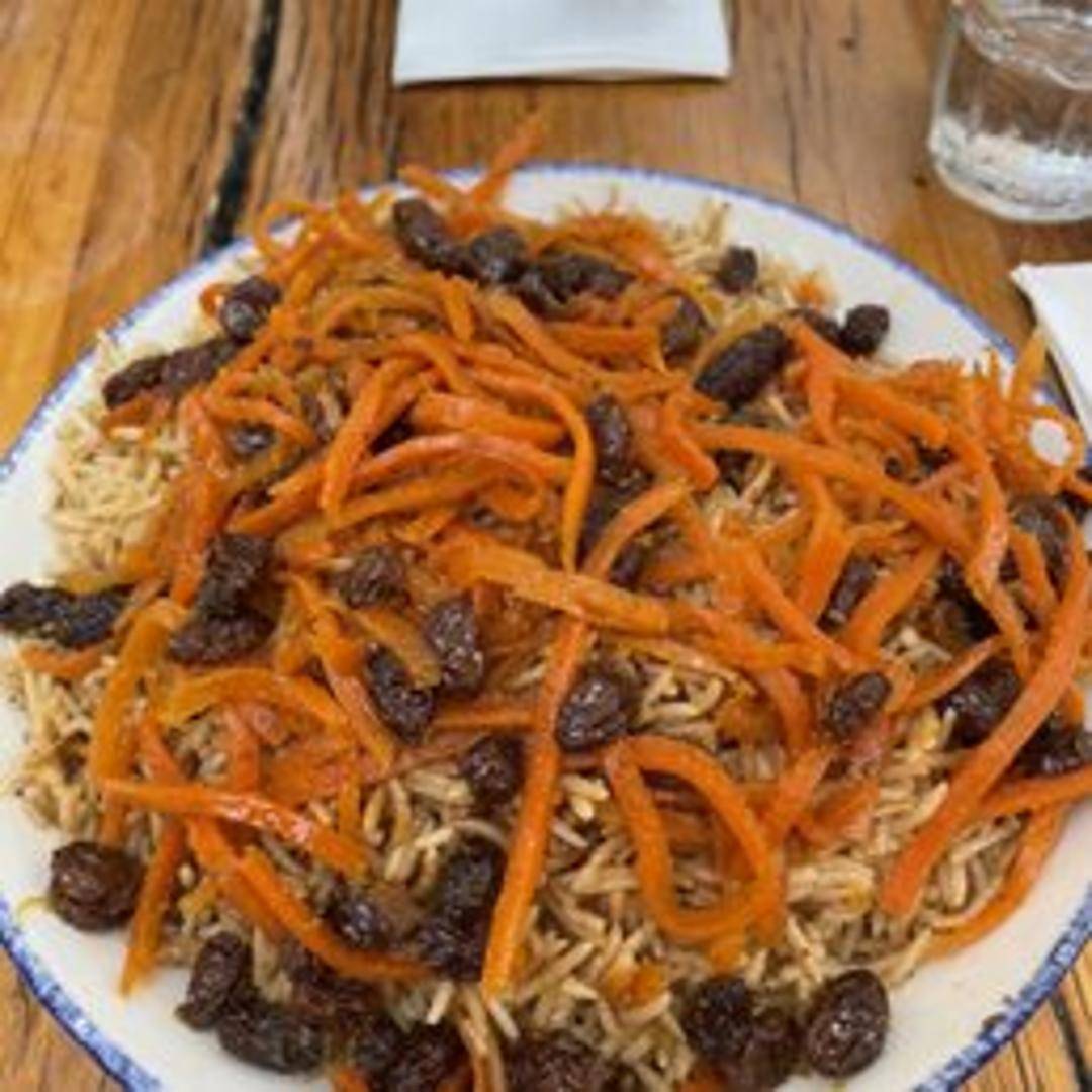 A classic centerpiece of Afghan cuisine, this aromatic long-grain basmati rice dish is slow-cooked with tender pieces of spiced meat (often lamb or chicken), caramelized carrots, and sweet raisins, creating a harmonious blend of savory and subtly sweet flavors. Garnished with slivered almonds or pistachios, it's a rich and celebratory dish.