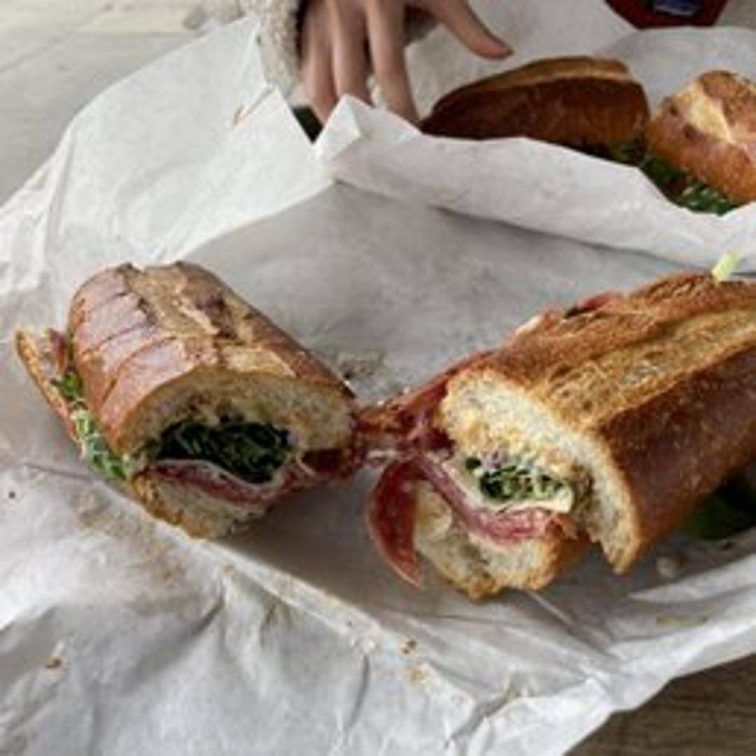 A hearty sandwich featuring slices of Soppressata Salami, typically served on a French Baguette or similar bread. May include cheese, lettuce, and a vinaigrette or other dressing.