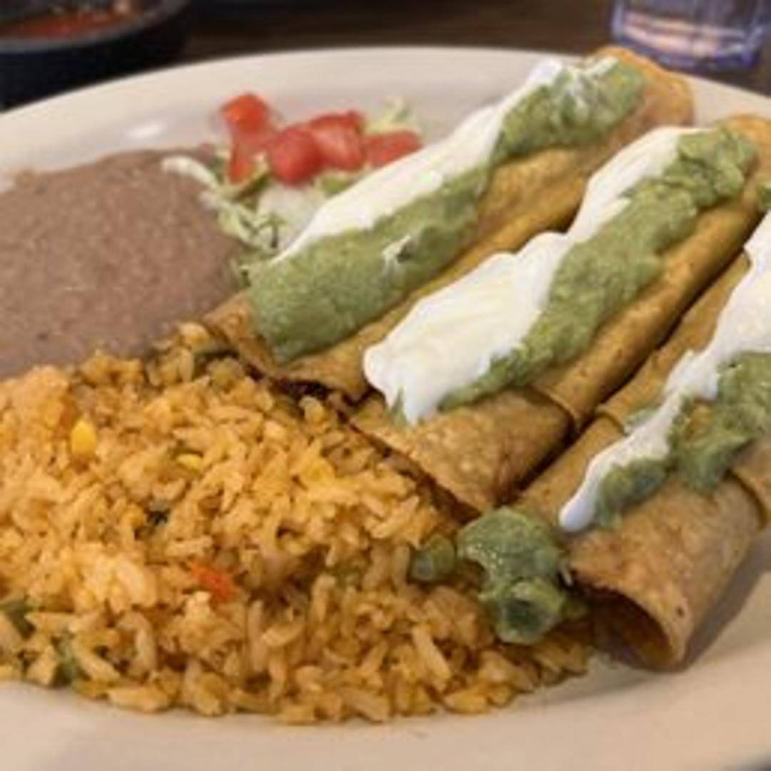 Four crispy, golden-fried corn tortillas filled with your choice of seasoned shredded chicken or shredded beef. Served with a side of creamy guacamole, sour cream, and your choice of salsa for dipping. Garnished with shredded lettuce and cotija cheese.