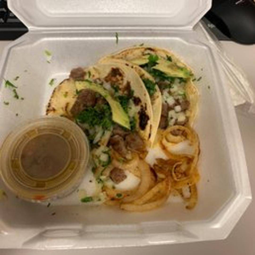 Three corn tortillas filled with marinated and grilled steak, topped with diced onions, cilantro, and a side of lime wedges. Served with your choice of salsa.