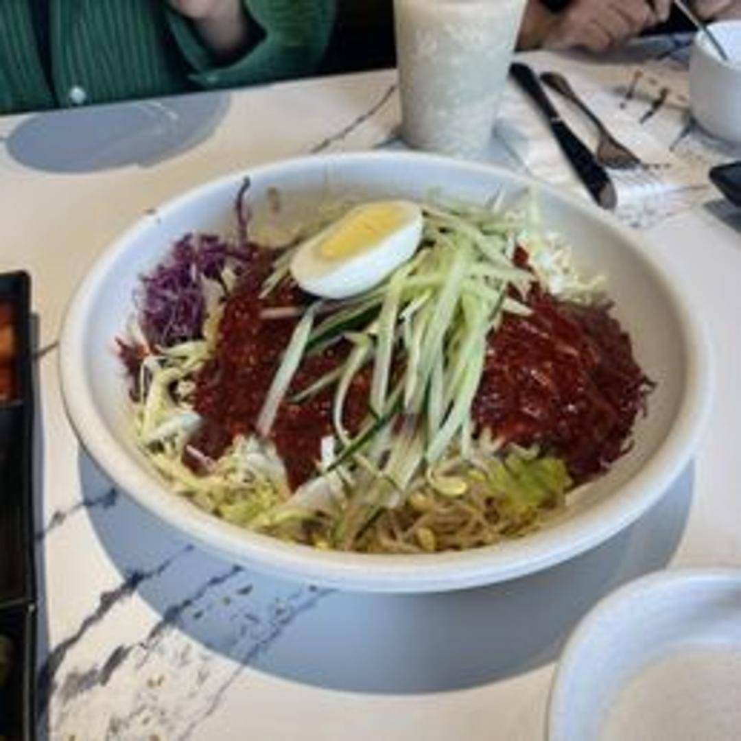 Korean chewy noodles mixed in a spicy, tangy, and sweet gochujang-based sauce. Topped with fresh vegetables like shredded cabbage, lettuce, carrots, and boiled egg. A flavorful and refreshing dish.