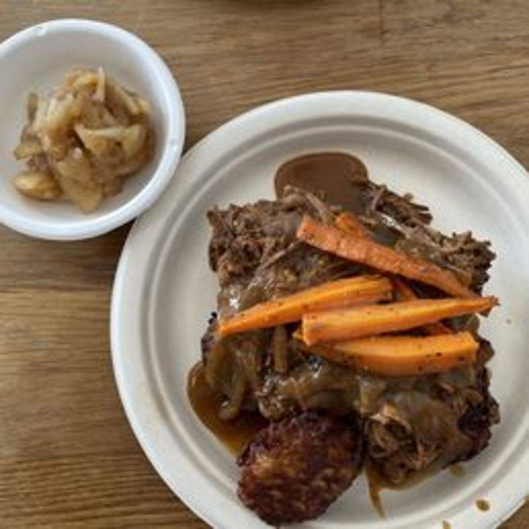A hearty and comforting latke topped with braised brisket, caramelized onions, and a savory gravy.