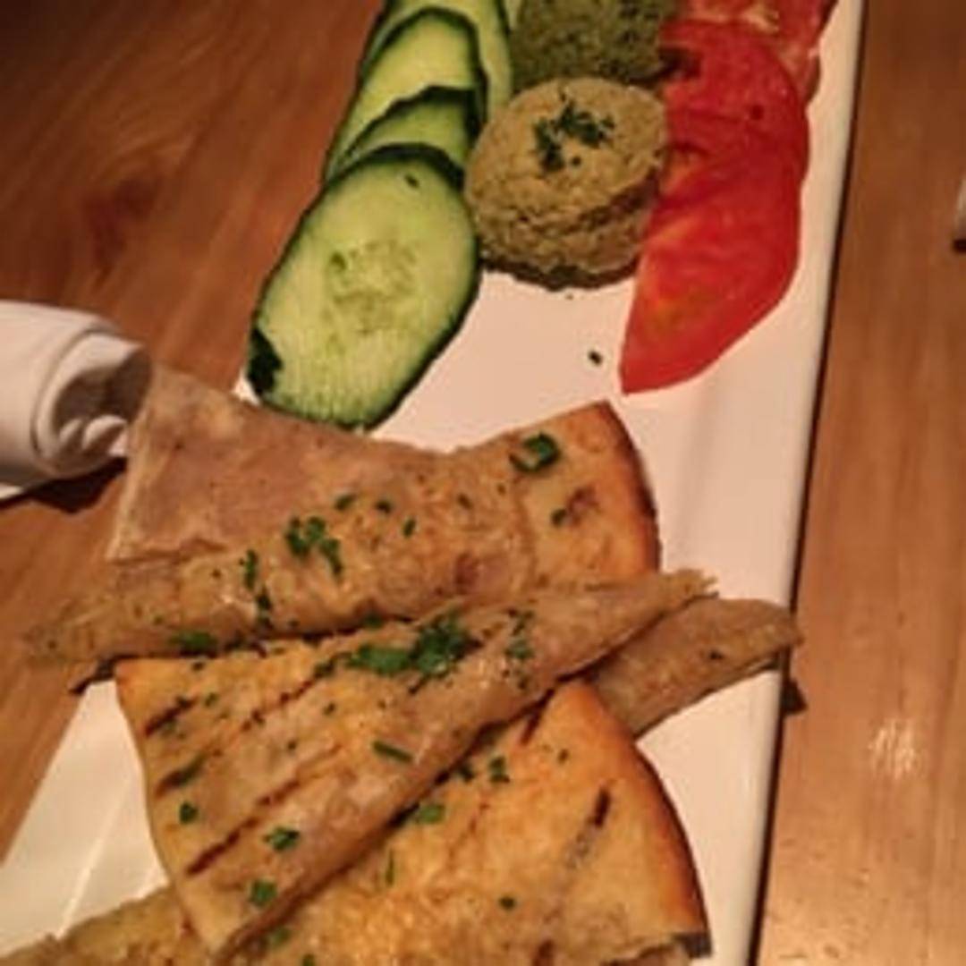 A selection of three house-made hummus flavors: classic, roasted red pepper, and cilantro jalapeño. Served with warm pita bread, carrots, celery, and cucumbers for dipping.