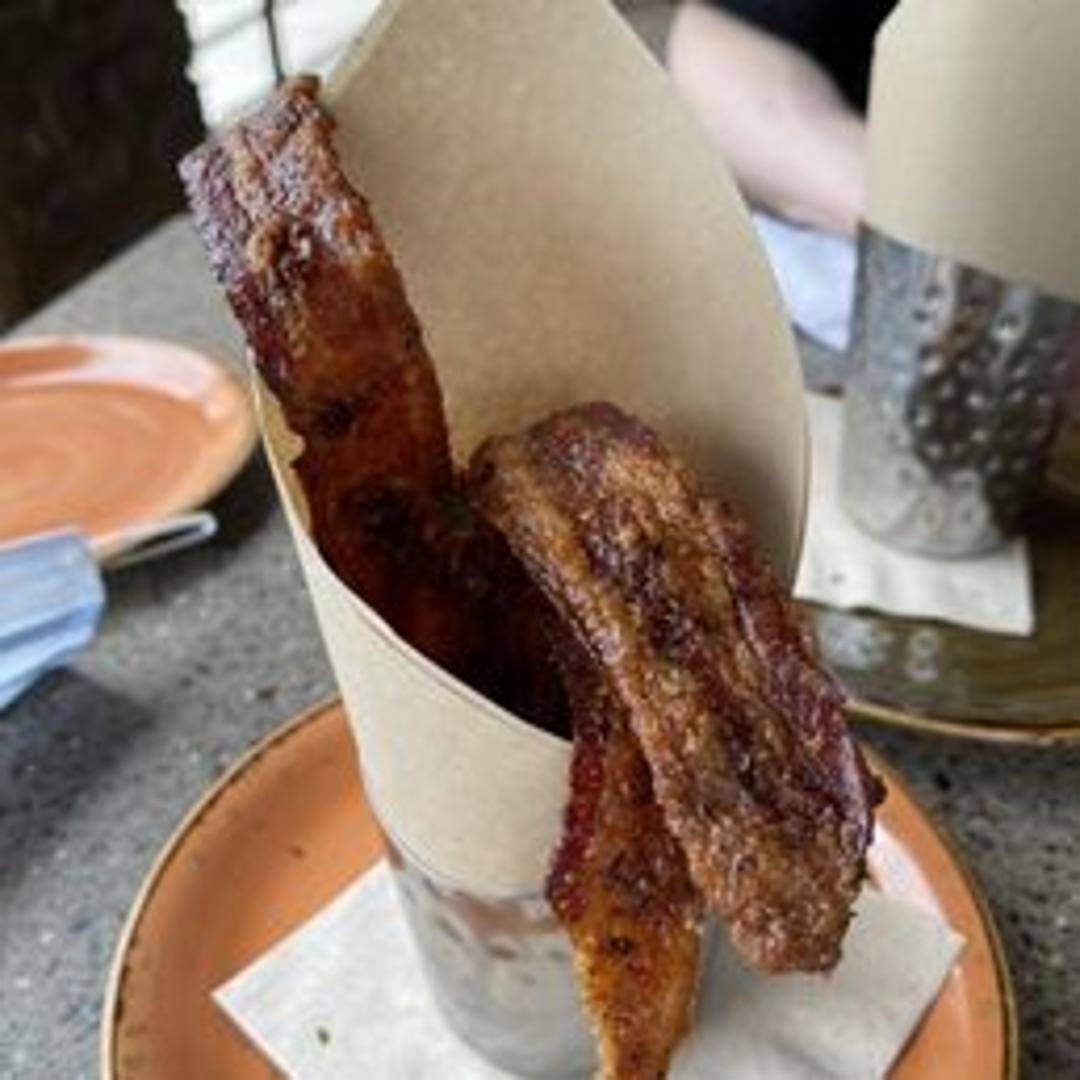 Crispy bacon coated in brown sugar and chili flakes, baked until caramelized and delicious.