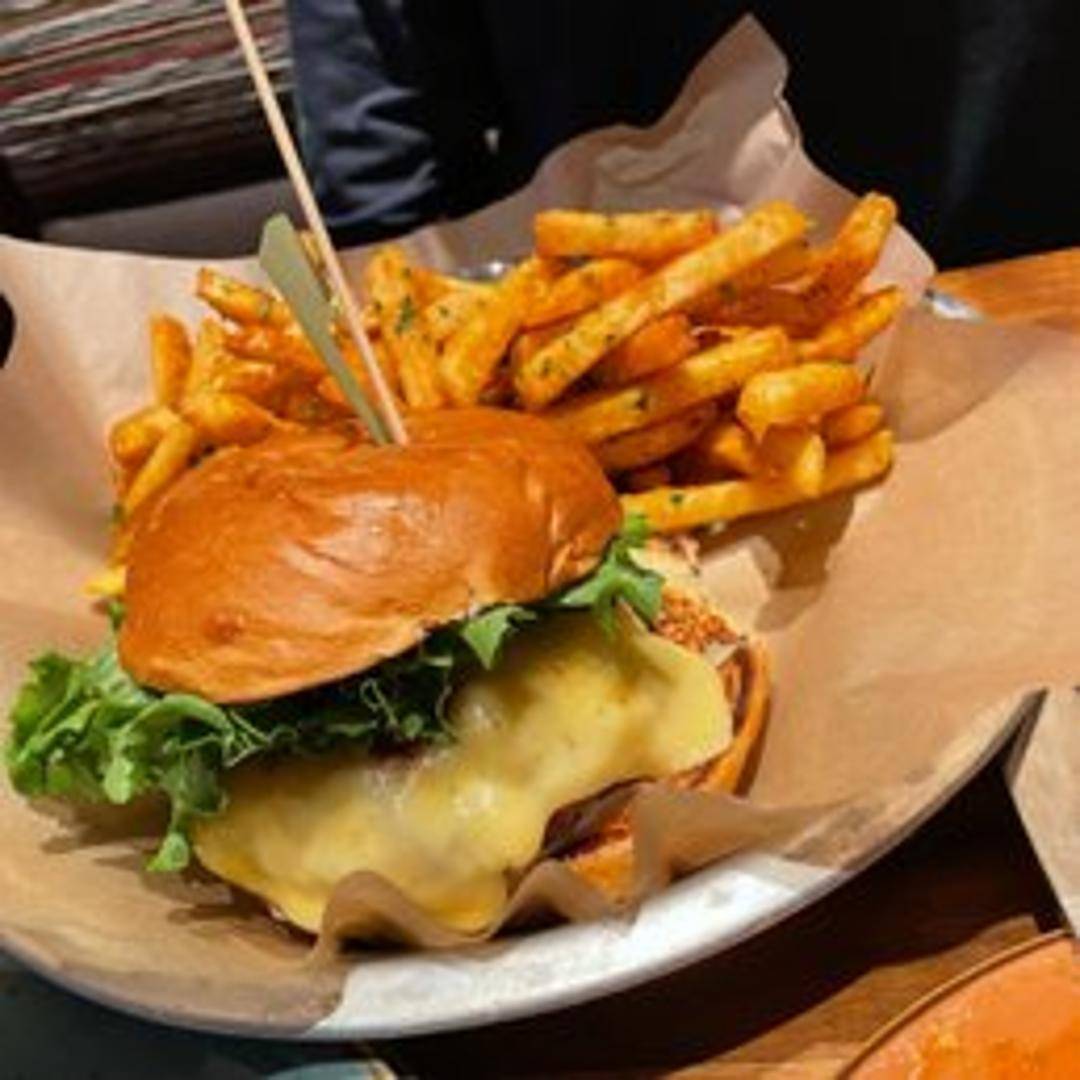 All-natural, lean bison patty topped with bacon, cheddar cheese, caramelized onions, roasted garlic aioli, and lettuce on a toasted brioche bun. Served with your choice of side.