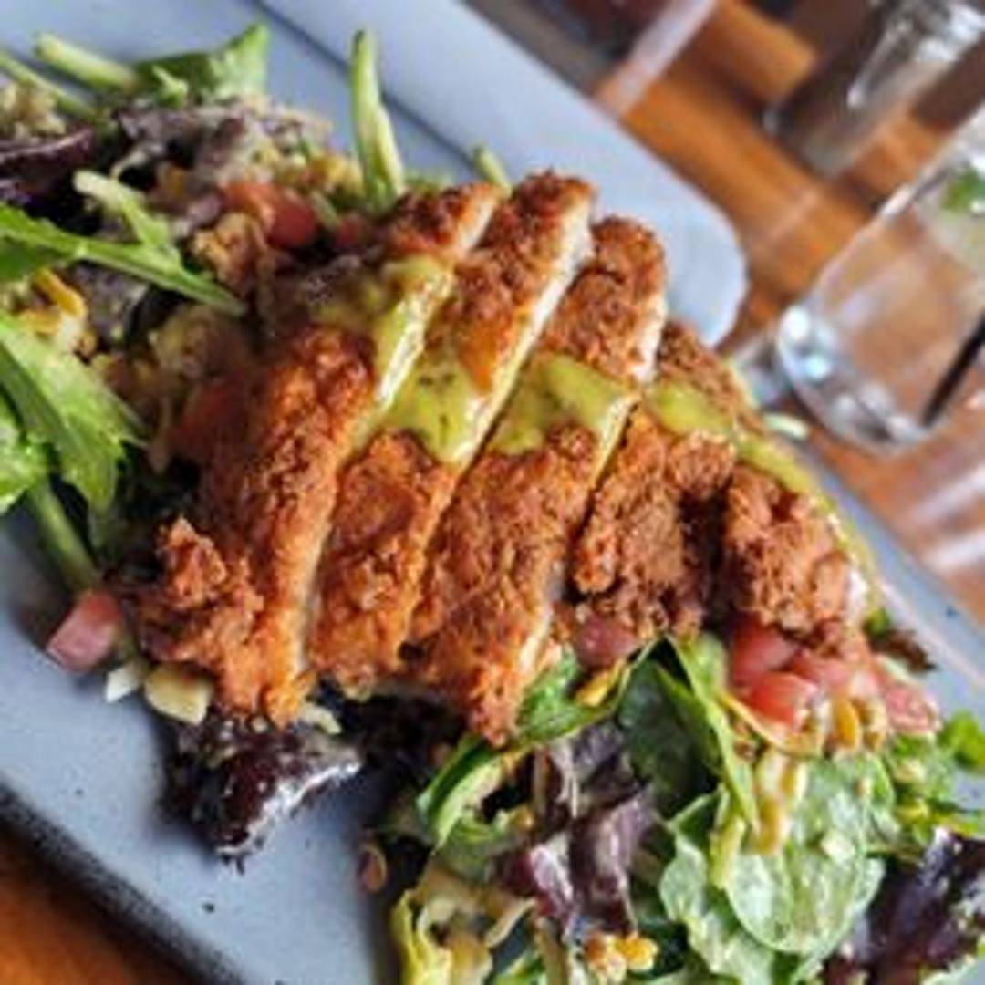 Crispy fried chicken breast, mixed greens, tomato, avocado, corn, black beans, cheddar cheese, and ranch dressing.