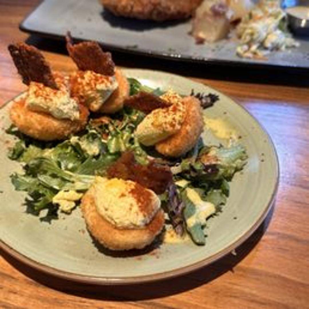 Classic deviled eggs lightly fried, topped with smoked paprika and bacon.