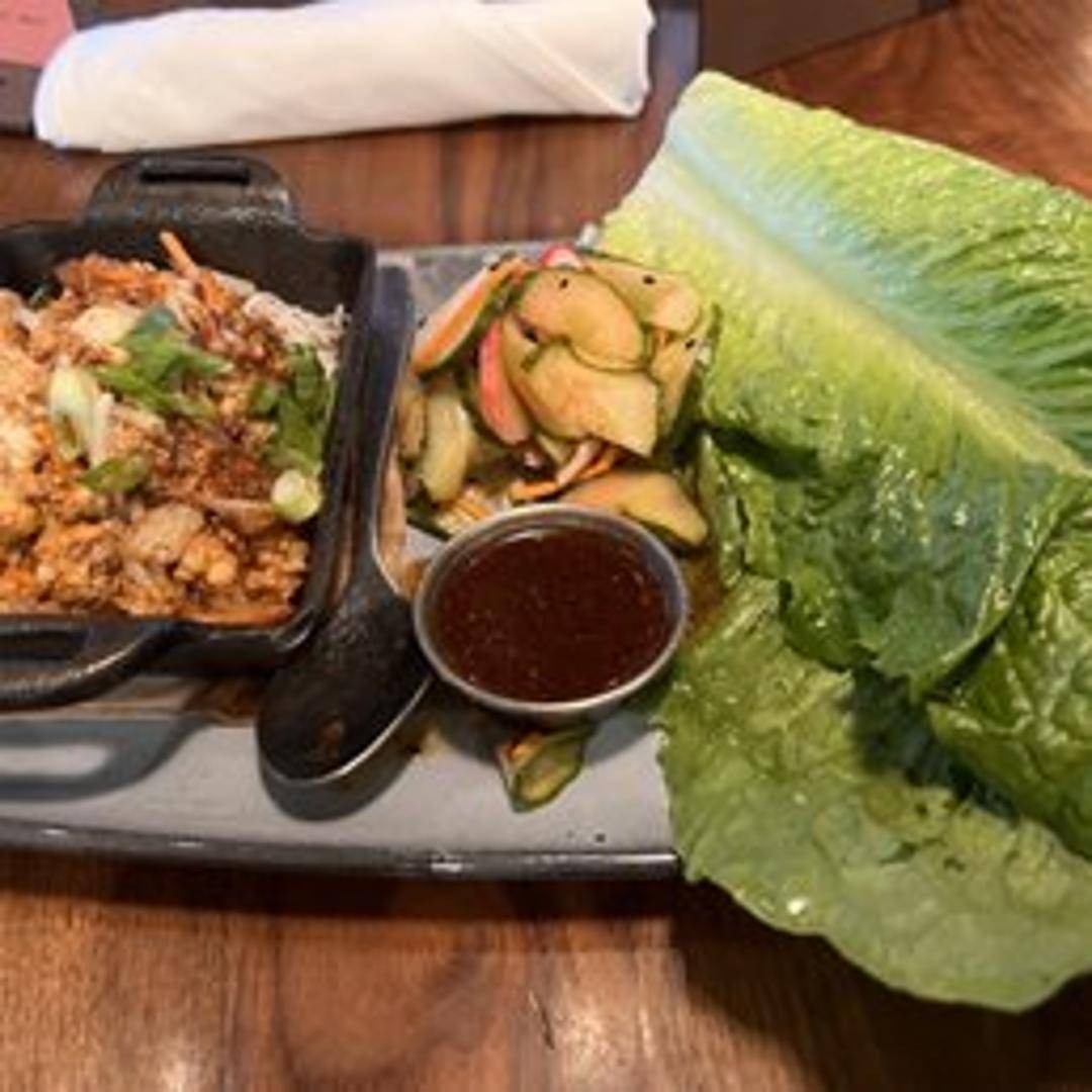 Savory ground chicken, water chestnuts, mushrooms, green onions, and carrots served with crisp lettuce cups and a sweet and spicy dipping sauce.