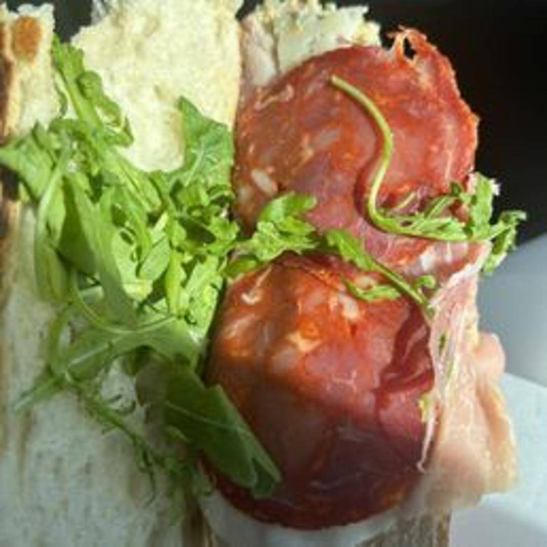 A sandwich featuring Catalan-style flavors, likely including ingredients such as jamón serrano (Spanish ham), Manchego cheese, roasted red peppers, and aioli on a crusty bread.