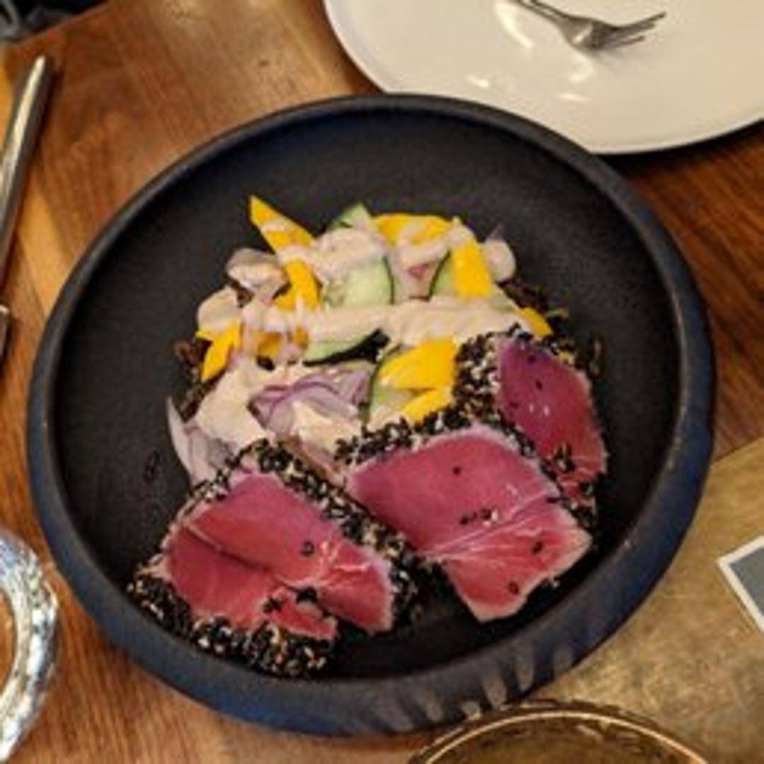 Exquisite sashimi-grade tuna, meticulously seared for a fleeting moment to achieve a perfect rare interior and a delicate crust. Sliced thin and typically presented with a vibrant ponzu reduction, a sprinkle of toasted sesame seeds, and delicate garnishes, offering a harmonious blend of rich umami and bright citrus notes.