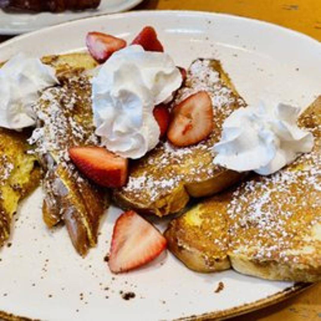 Two slices of thick-cut challah bread dipped in a sweet batter and grilled to perfection, then stuffed with a creamy, sweet cheese filling. Topped with your choice of fruit compote (strawberries, blueberries, or peaches) and a dusting of powdered sugar. Served with a side of syrup.