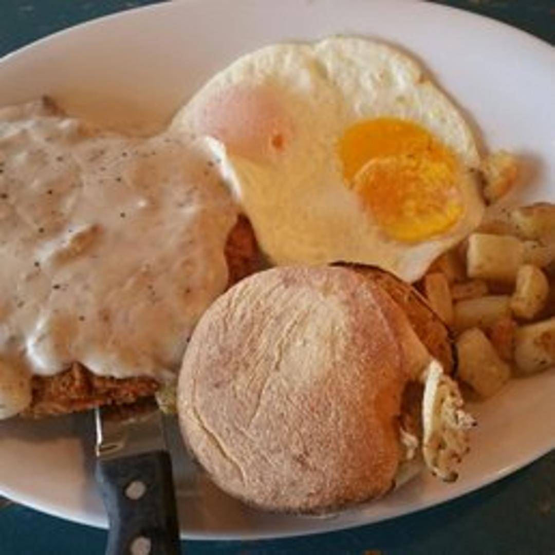 A Southern-inspired breakfast favorite. A tender, breaded steak fried to a golden-brown and smothered in creamy country gravy. Served with two eggs cooked to your preference and your choice of toast or English muffin.