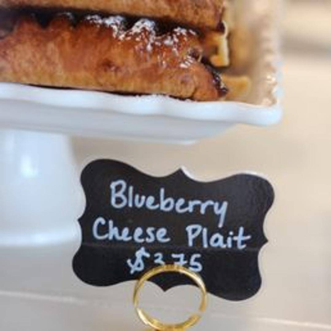A flaky, braided pastry filled with a creamy cheese mixture and sweet blueberries, topped with a delicate glaze.