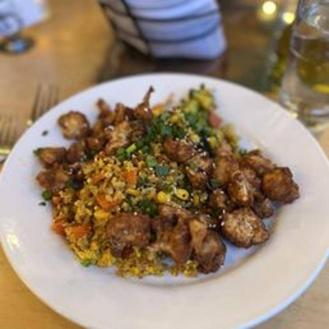 Crispy fried cauliflower florets tossed in a sweet and tangy orange sauce, garnished with sesame seeds and green onions.