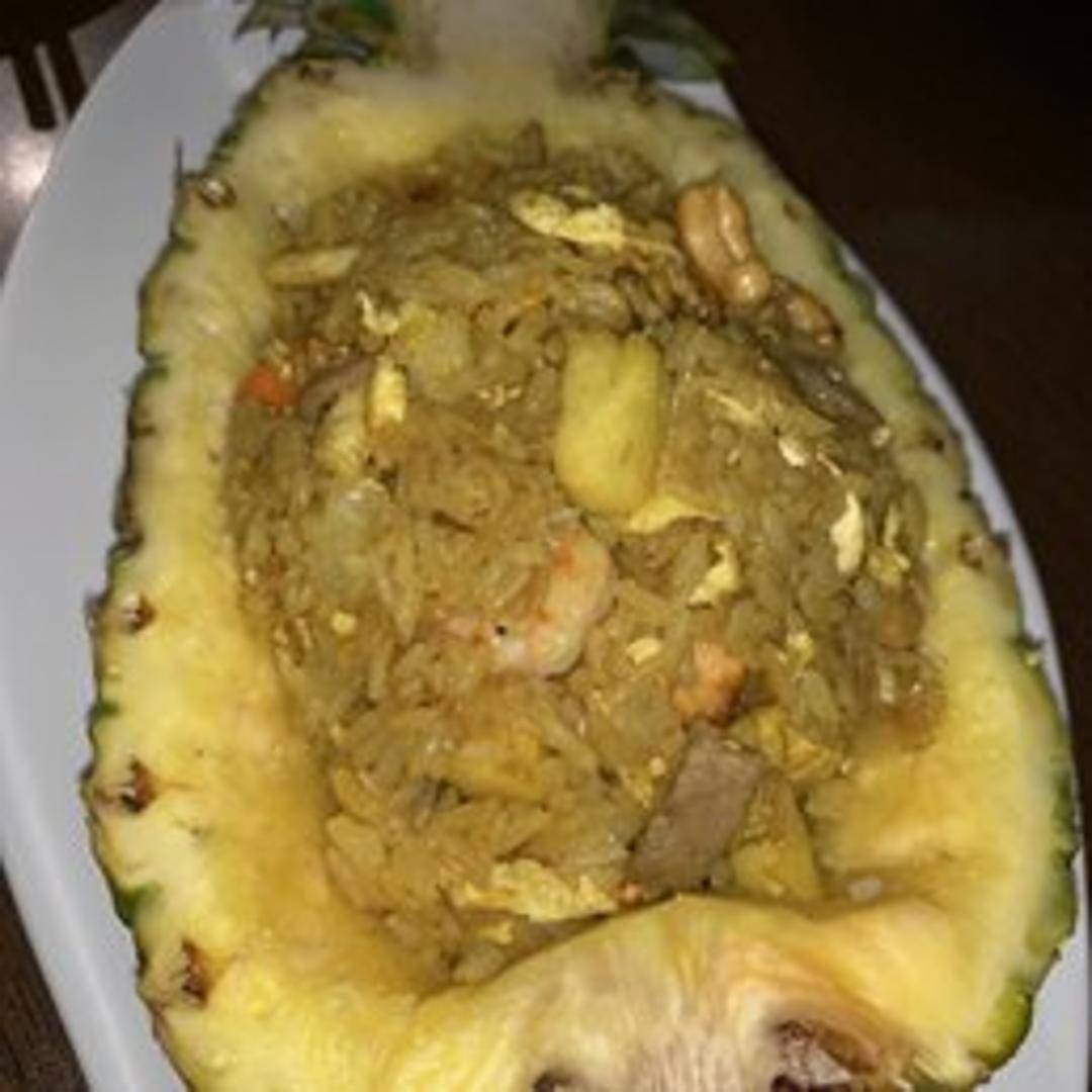 Savory fried rice stir-fried with chunks of sweet pineapple, peas, carrots, onions, and your choice of protein (chicken, pork, beef, shrimp, or tofu). Flavored with soy sauce and a hint of curry powder, served in a cored-out pineapple.