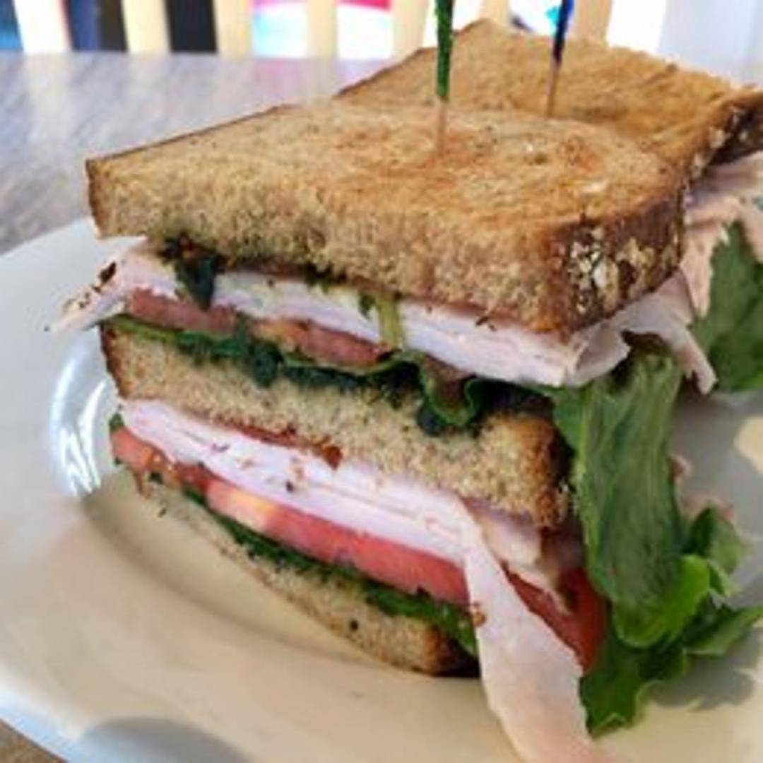 A triple-decker delight featuring sliced turkey breast, crispy bacon, crisp lettuce, ripe tomato slices, and mayonnaise, stacked between three slices of toasted bread (white, wheat, or sourdough).
