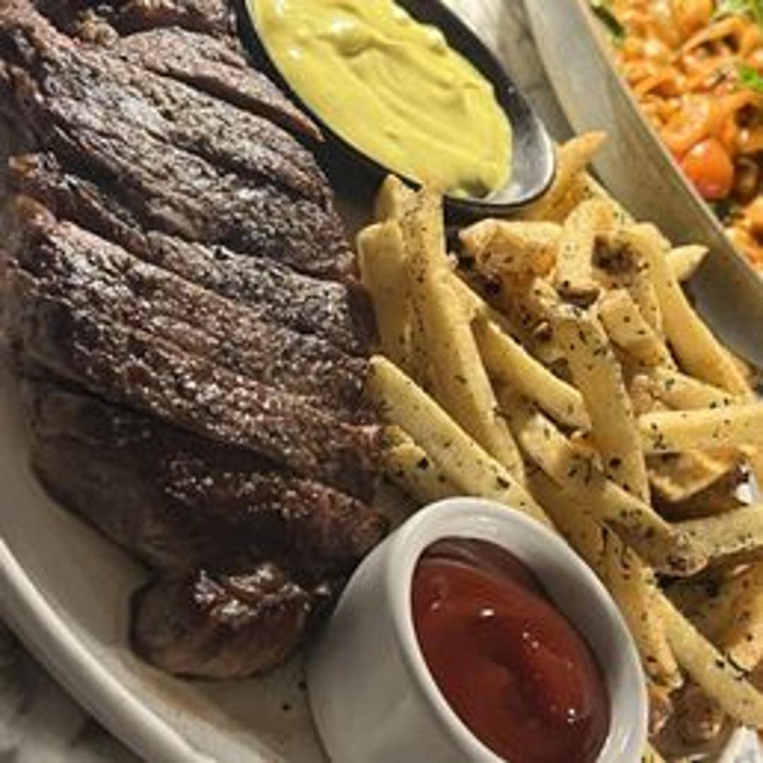 Grilled steak served with a generous portion of crispy, golden-brown french fries. Accompanied by your choice of béarnaise or peppercorn sauce.