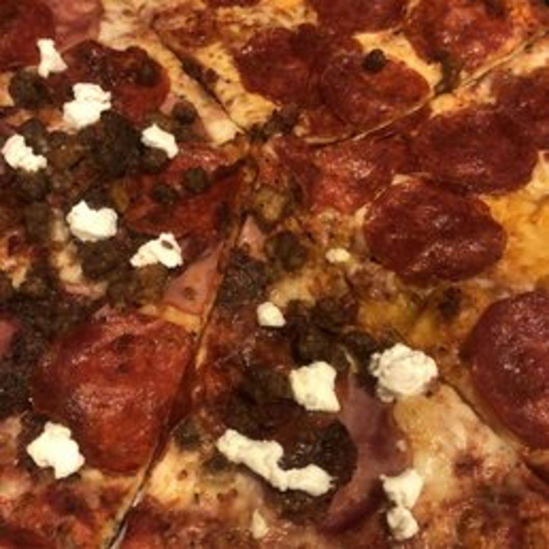 A specialty pizza loaded with a variety of meats, likely including sausage, pepperoni, and possibly bacon or ham. Exact ingredients may vary.
