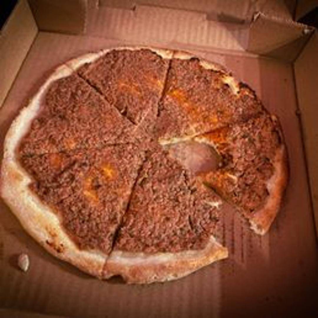 Thin, crispy flatbread topped with a mixture of ground meat (typically lamb or beef), tomatoes, onions, herbs, and spices, baked until flavorful and slightly charred.